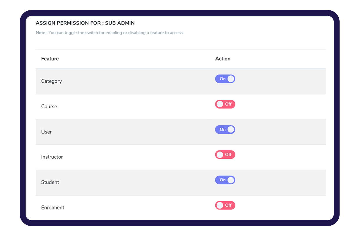Allows multiple admins with tailored permissions, ensuring secure and efficient management of courses, users, and platform operations.