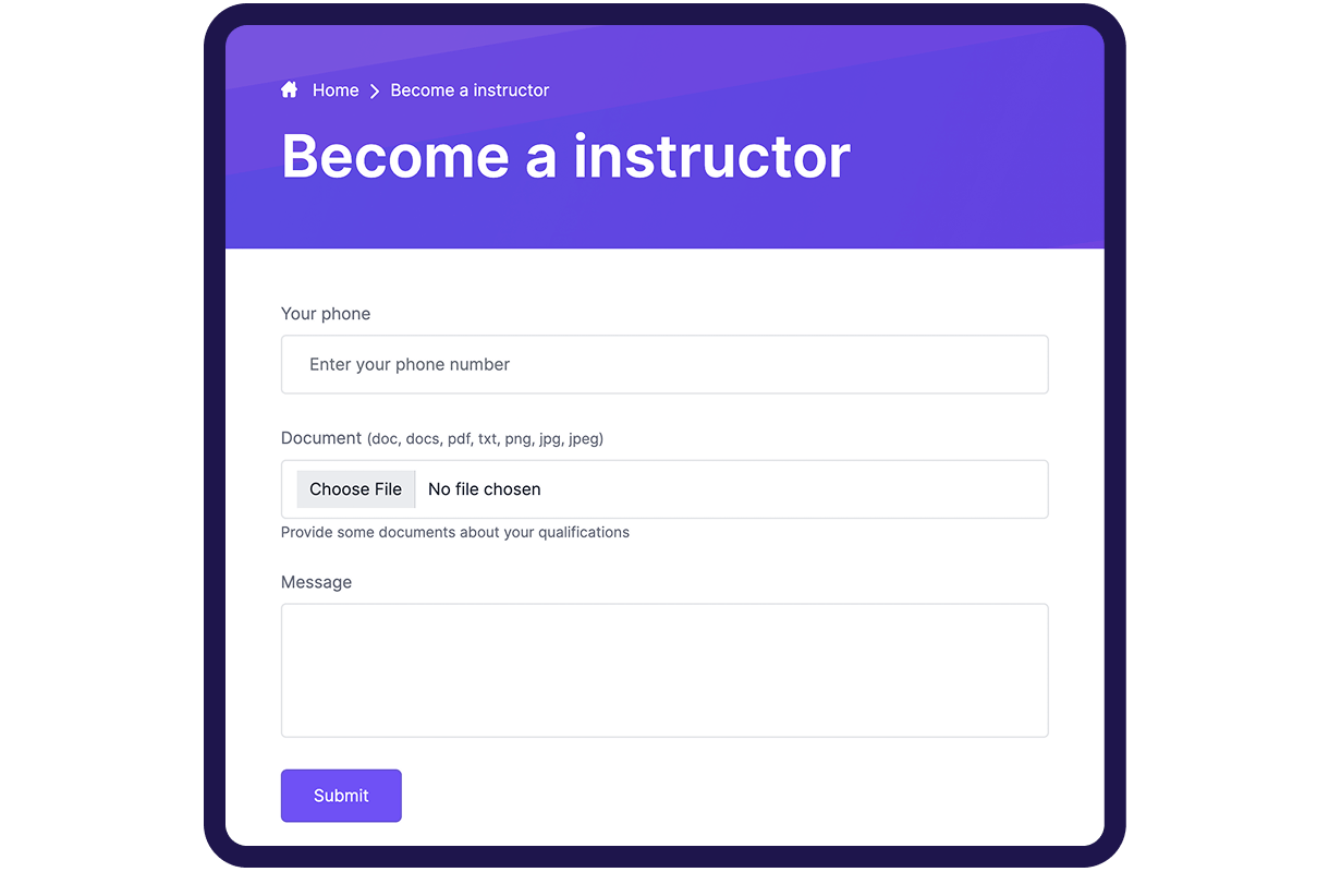 Academy LMS allows students to apply to become instructors, with admin approval or rejection.
