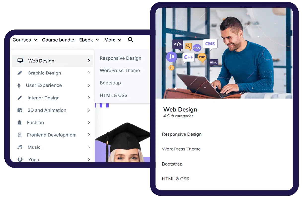 Effortless course structuring with unlimited top and subcategories for smooth navigation and a better learning journey.