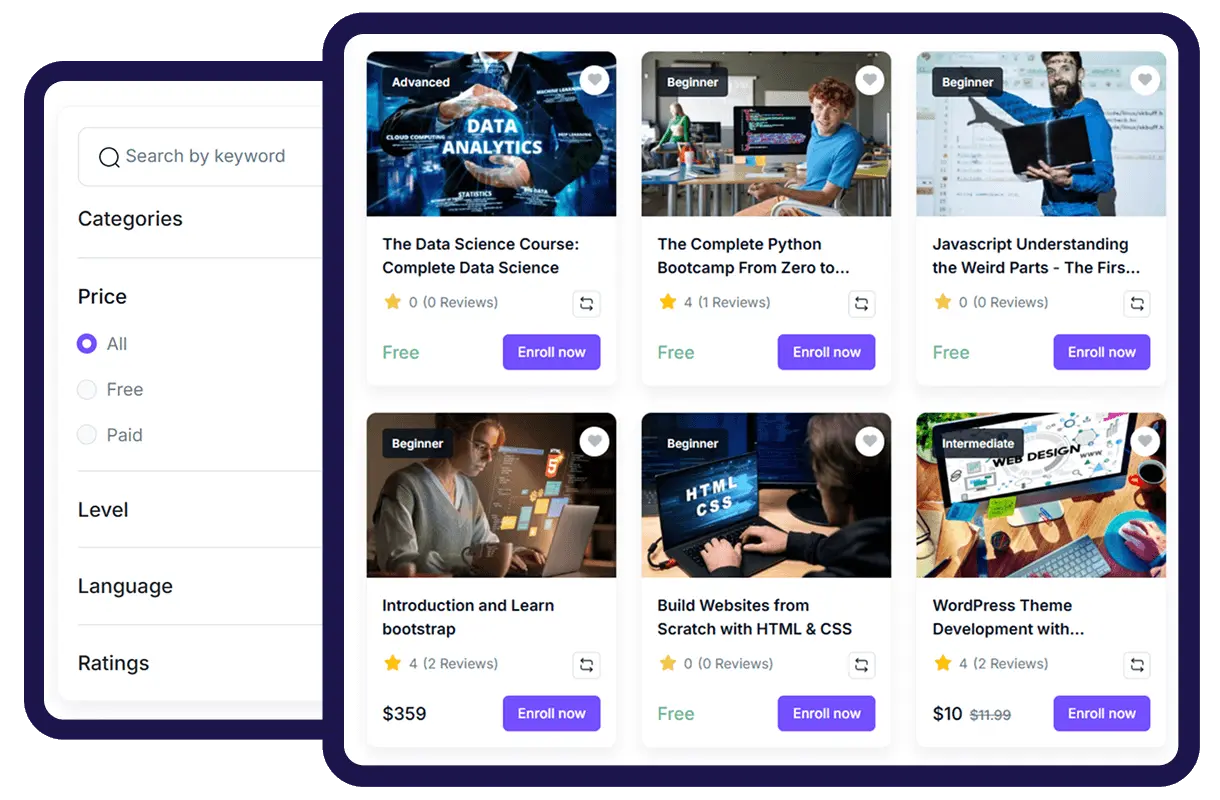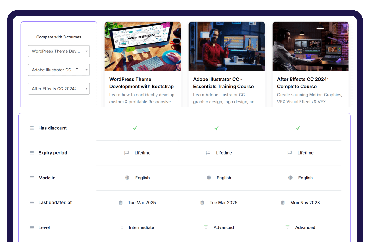 Easily compare up to three courses side by side, helping students make smarter learning choices before purchasing.