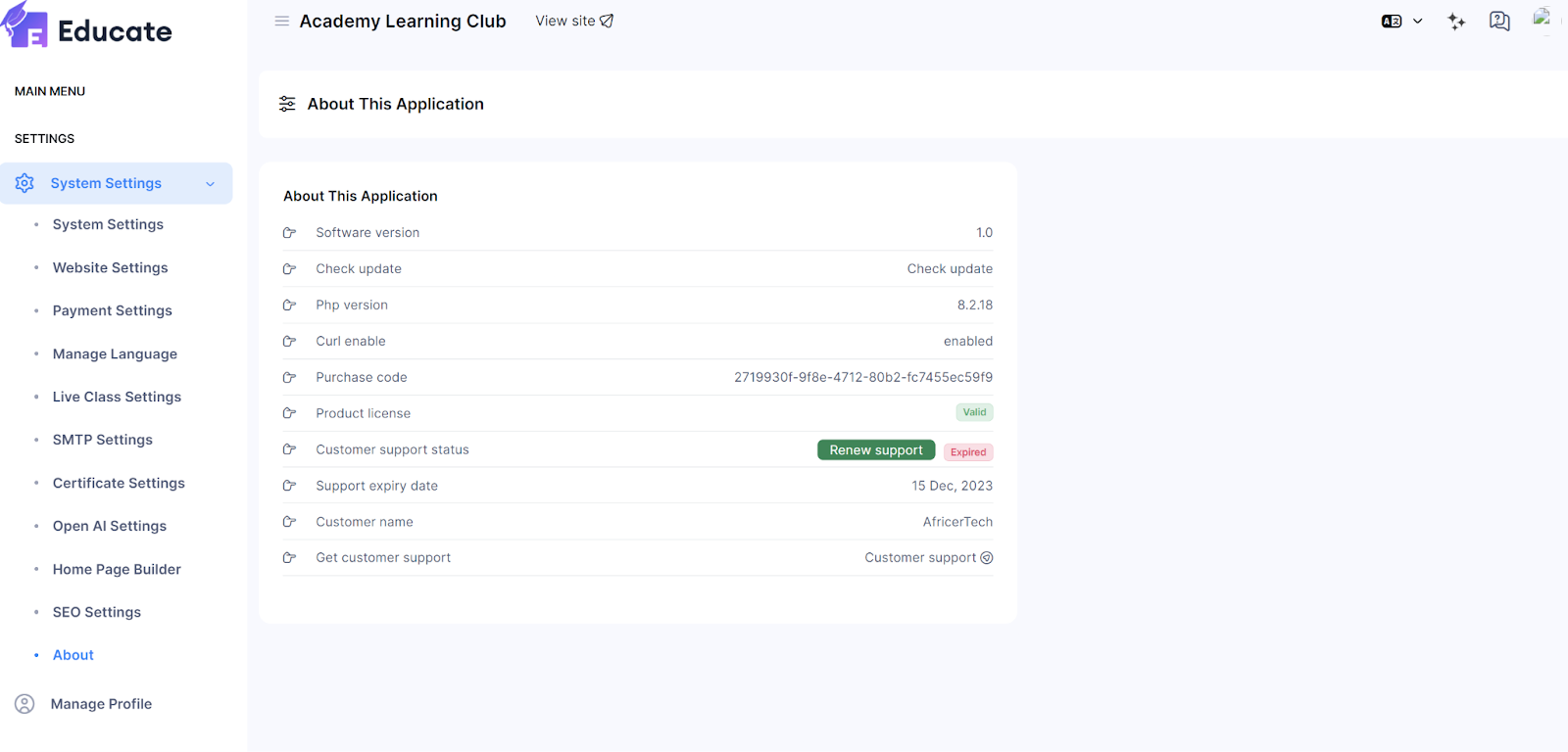 You can renew customer support by clicking on the Renew Support button, which will redirect you to the envatomarket page of the author to renew support.
