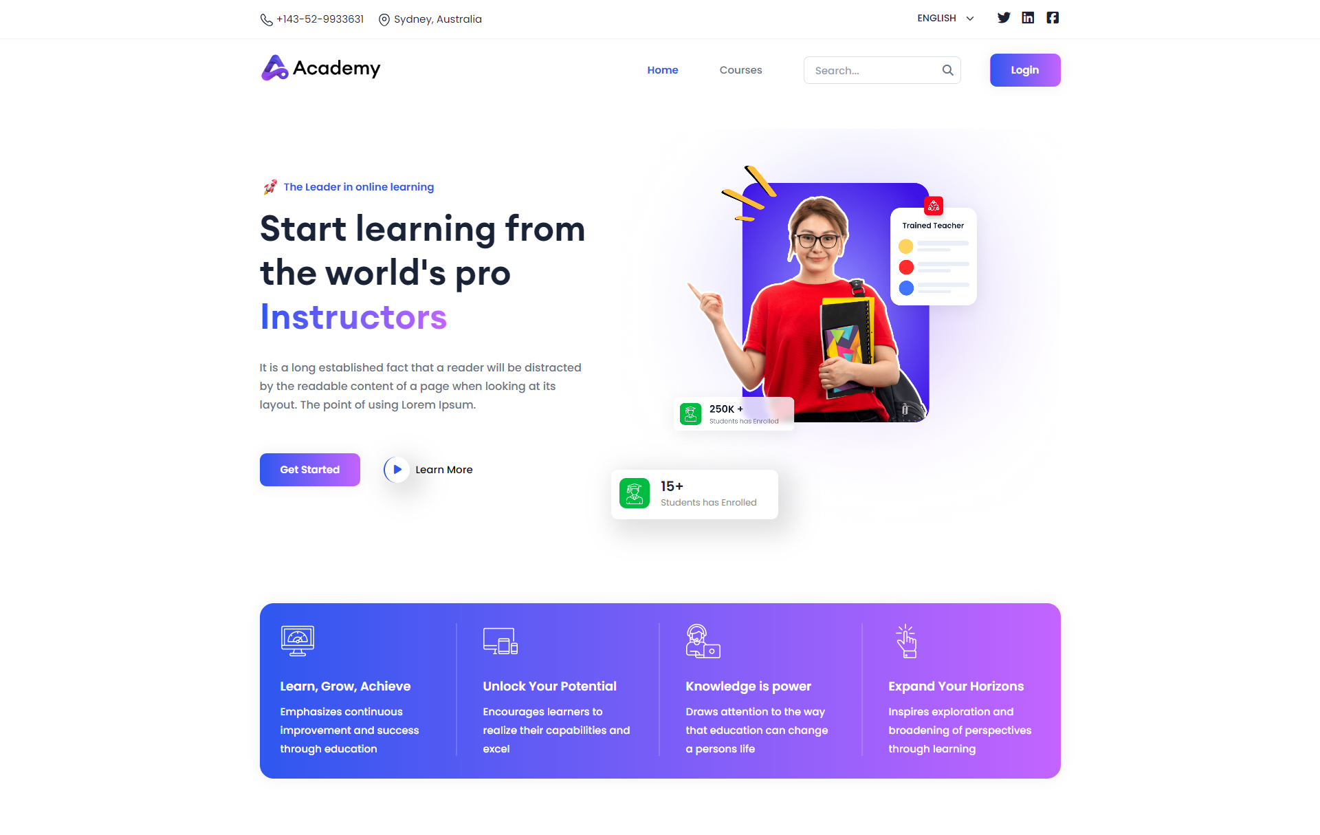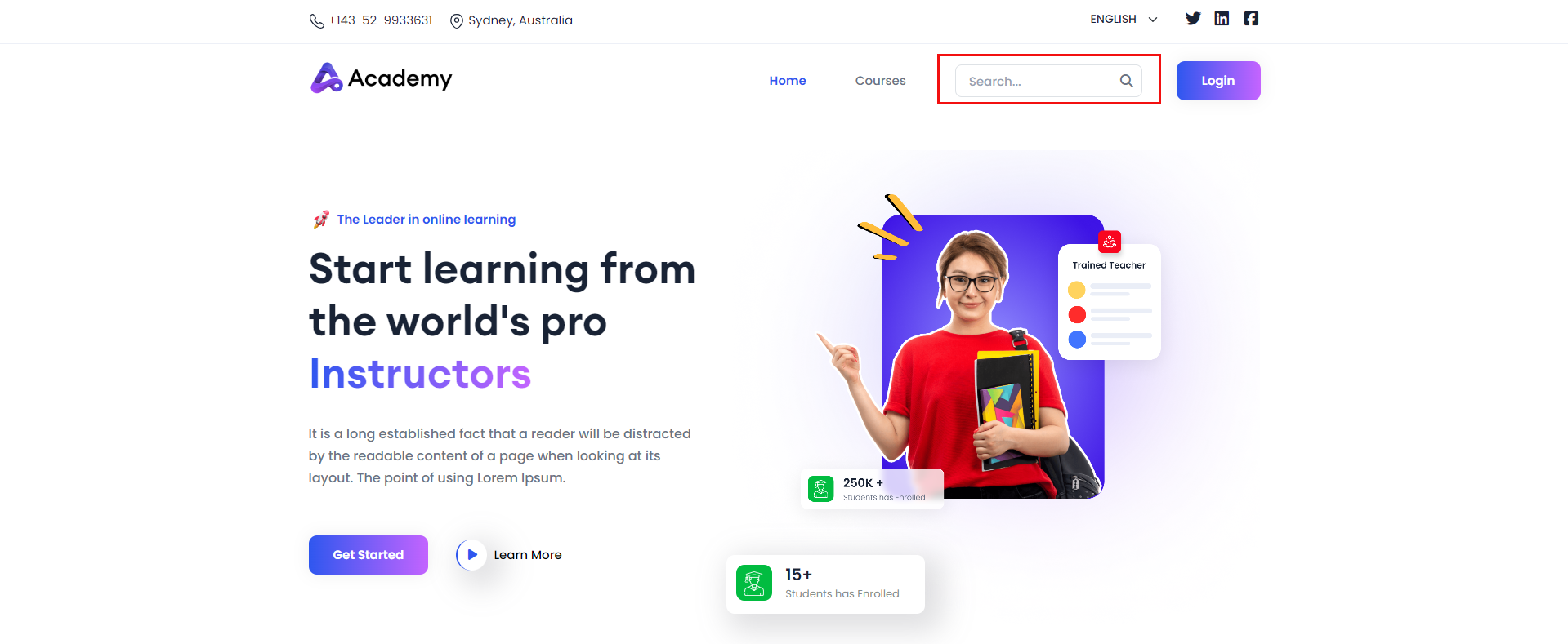 Users can freely access most frontend pages without the need to log in initially. Upon visiting the Academy LMS Laravel application without signing up, they can browse the Course Search option on the homepage, along with the top courses and featured courses highlighted for easy exploration.