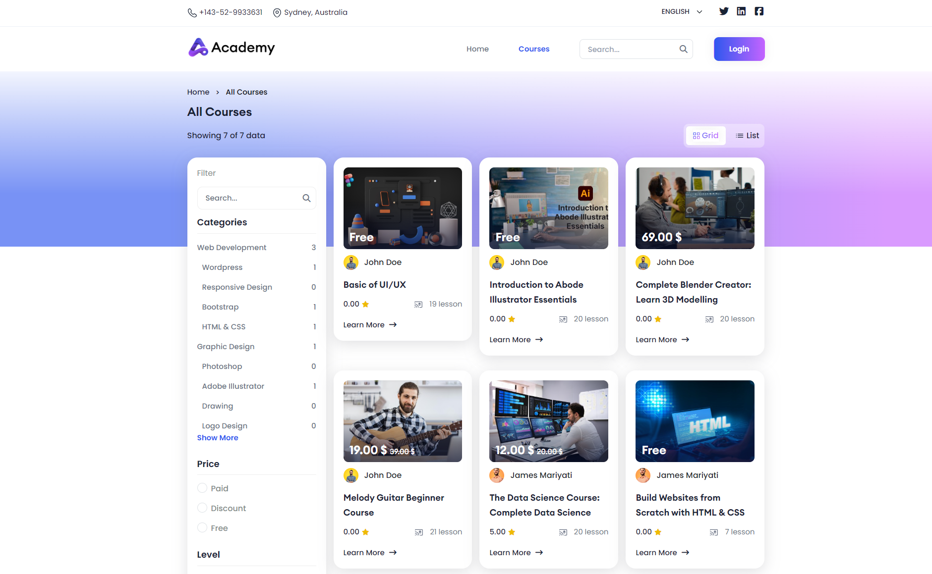If you click on the Courses option from the top navigation bar, you can view a detailed list of all courses available. You can search courses according to categories, price, level and language filters. Click on the selected course to find more information about the course.