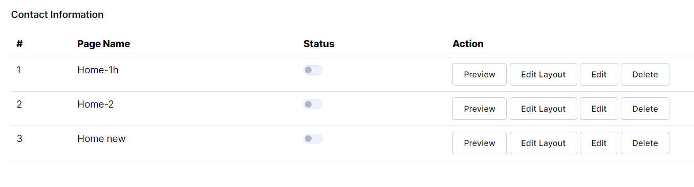 After you click submit, you can see the new page name inside the list with the name, status of the page (whether it is enabled or disabled), and actions you can take.