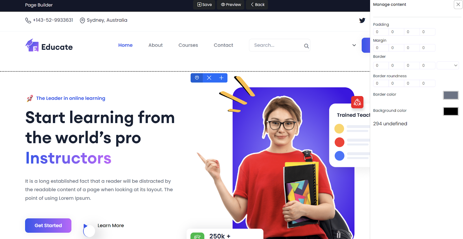 Click on the Settings button to manage the content more in detail. A side window will pop up, where you can edit the padding, margin, border, border roundness, border color, background color.