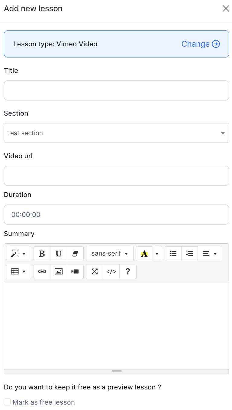Select the "Add lesson" button to add a new Vimeo video lesson.