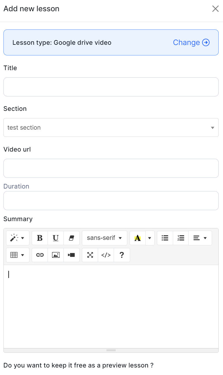 Select the "Add lesson" button to add a new Google Drive Video lesson.