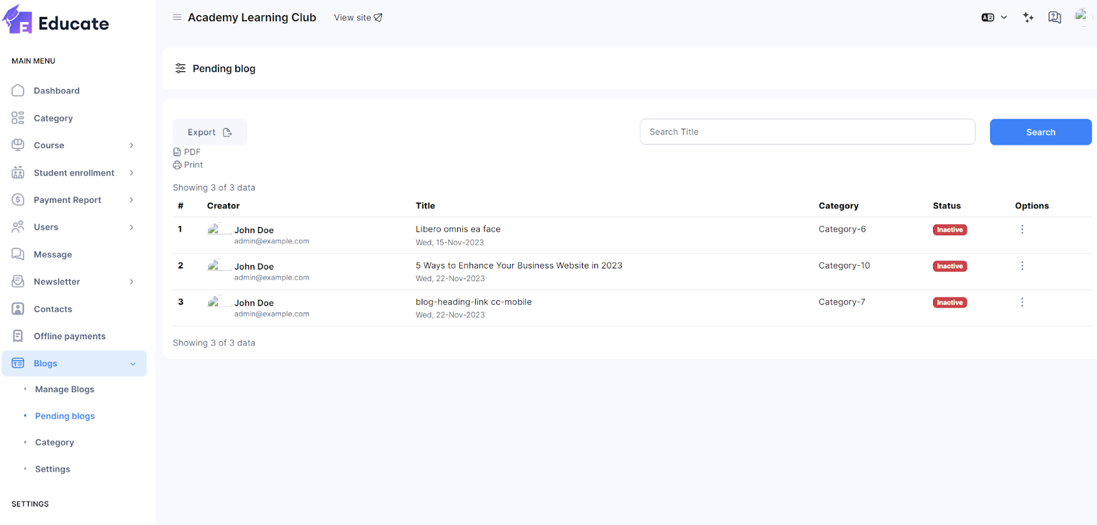 You can view all of the pending blogs which are waiting for admin approval to be published inside the Pending Blogs page.