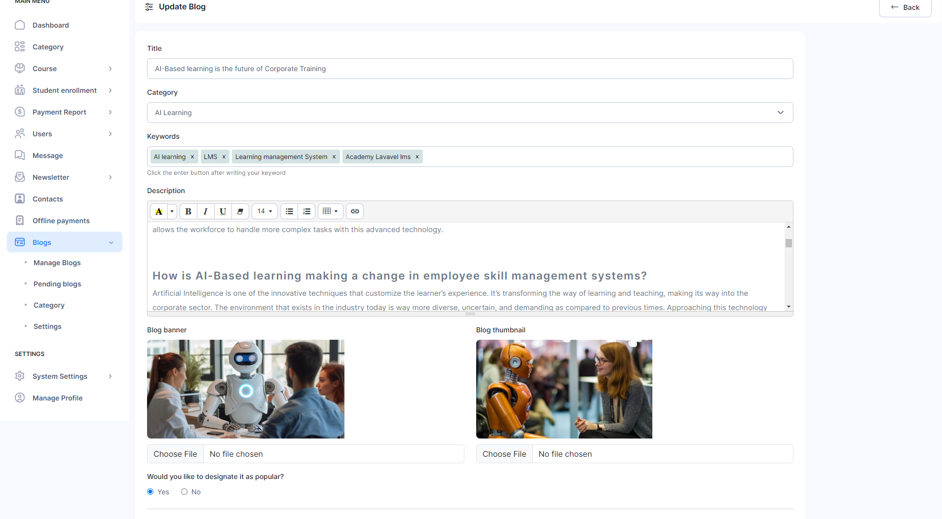 You can click on the checkbox for either Yes or No if you want to designate the blog as popular.