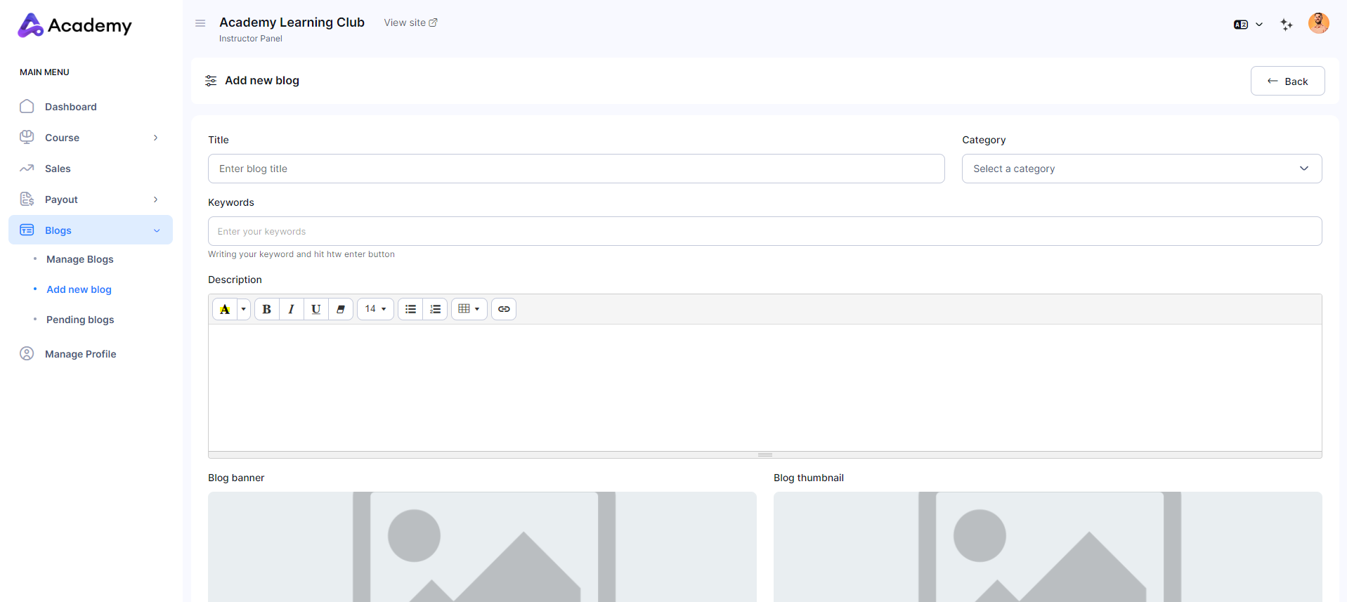 Instructors can create and manage new blogs, and wait for pending blogs to be approved and published by the admin.