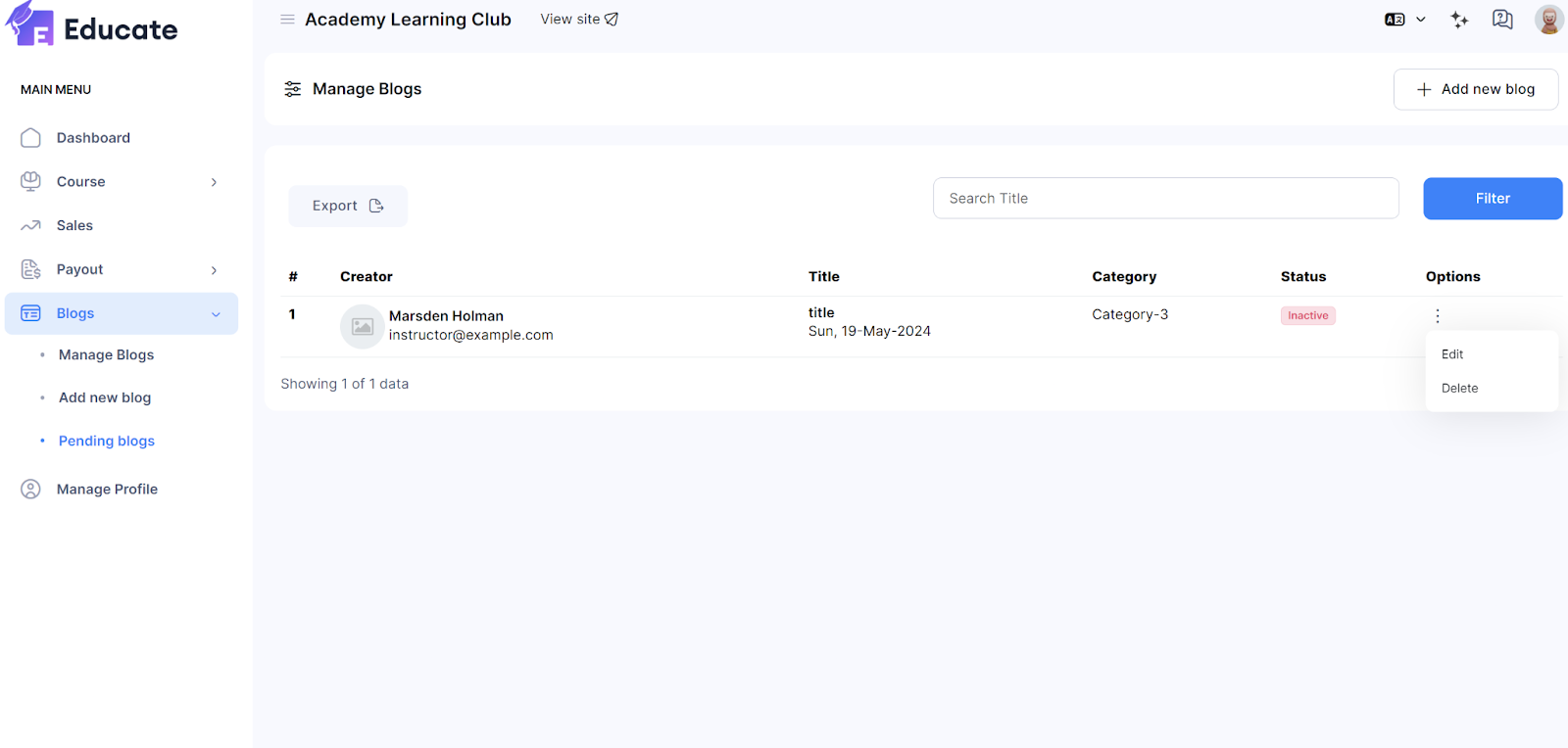 Instructors can view the pending blogs that are waiting to be approved by admin inside the Pending Blogs page.