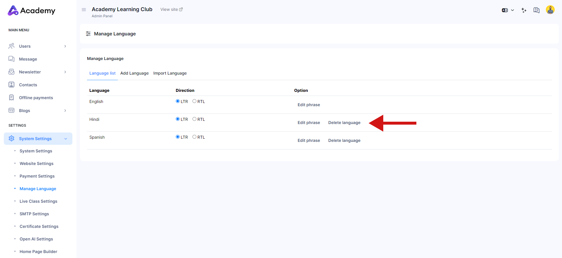 Academy LMS Laravel offers extensive language support, allowing you to change the system language of the application whenever needed. You have the flexibility to add new languages and customize phrases within the application. Additionally, you can import or export languages as JSON files directly from the application, making language management seamless and efficient.