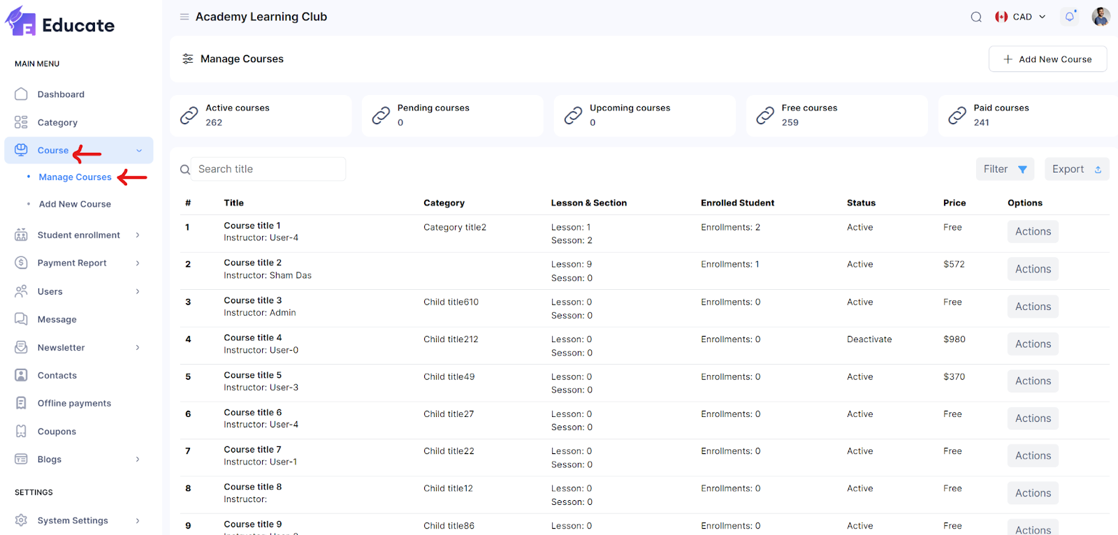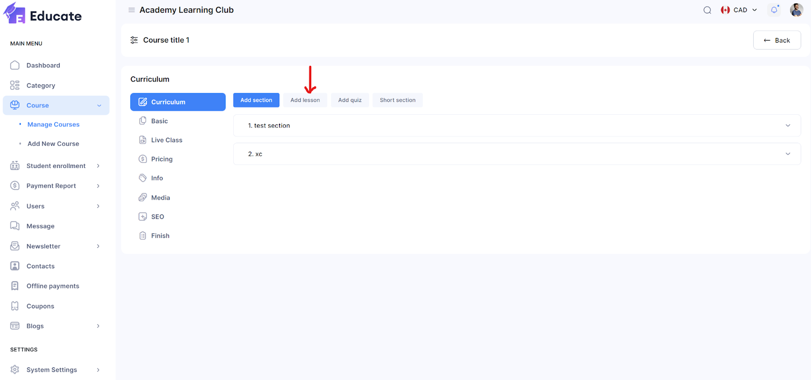 To select the optimal lesson type for your course and enhance its value, Academy LMS Laravel provides various platforms. Follow these steps to choose a lesson type for your course: