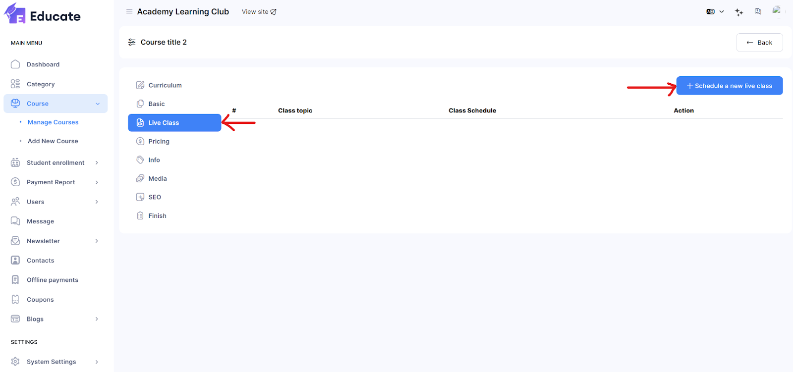 You can schedule new live classes for any course that you want, using Academy LMS Laravel application. Follow the steps below to add live classes to a course: