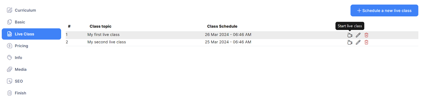 You can start a scheduled live class by clicking on the Start Live Class button beside the selected class.
