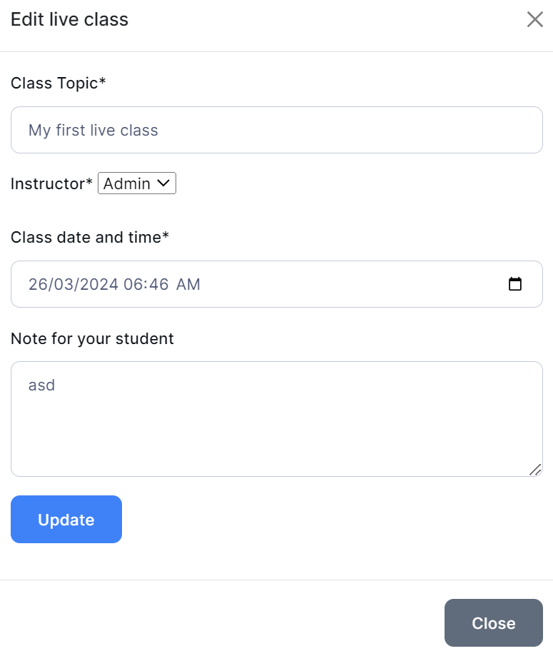 You can edit a class by clicking on the Edit button beside the class. Then the Edit Live class window will pop up, and you can edit the necessary information required.
