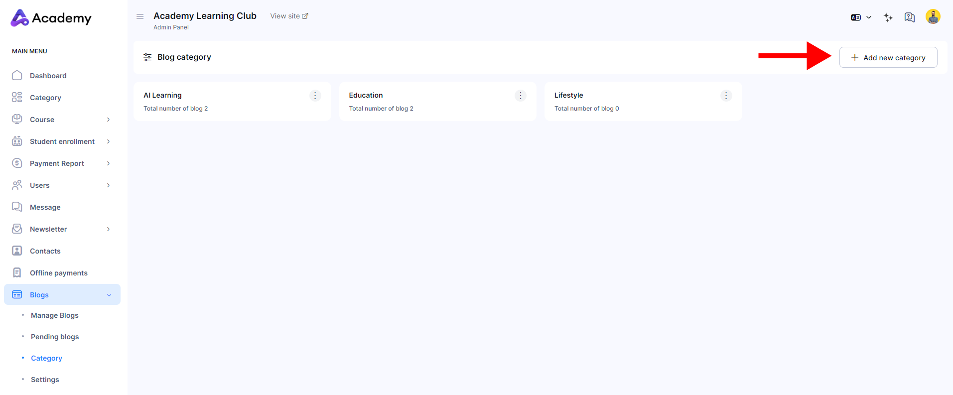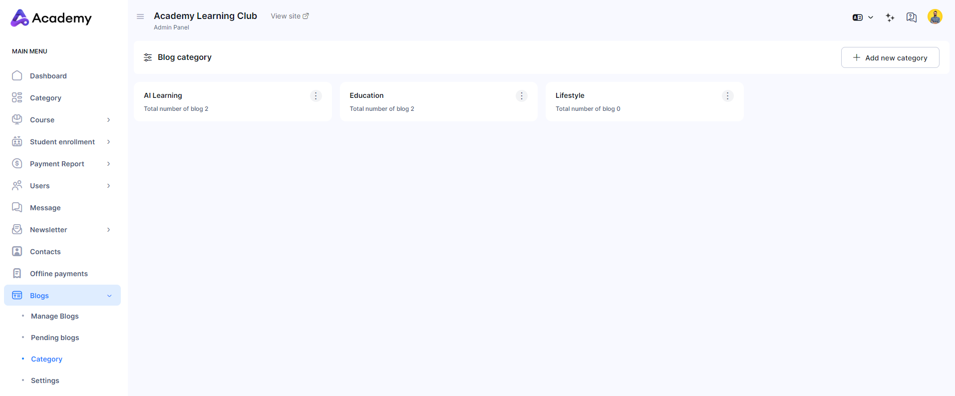 Create and manage blog categories from the backend as an admin, to make the process of publishing blogs easy for admins and instructors using your system.