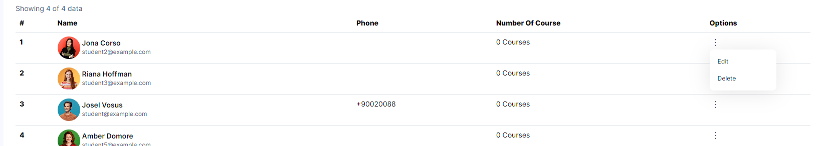 You can click on the “:” button under the Options column to Edit the student information, or Delete the student.
