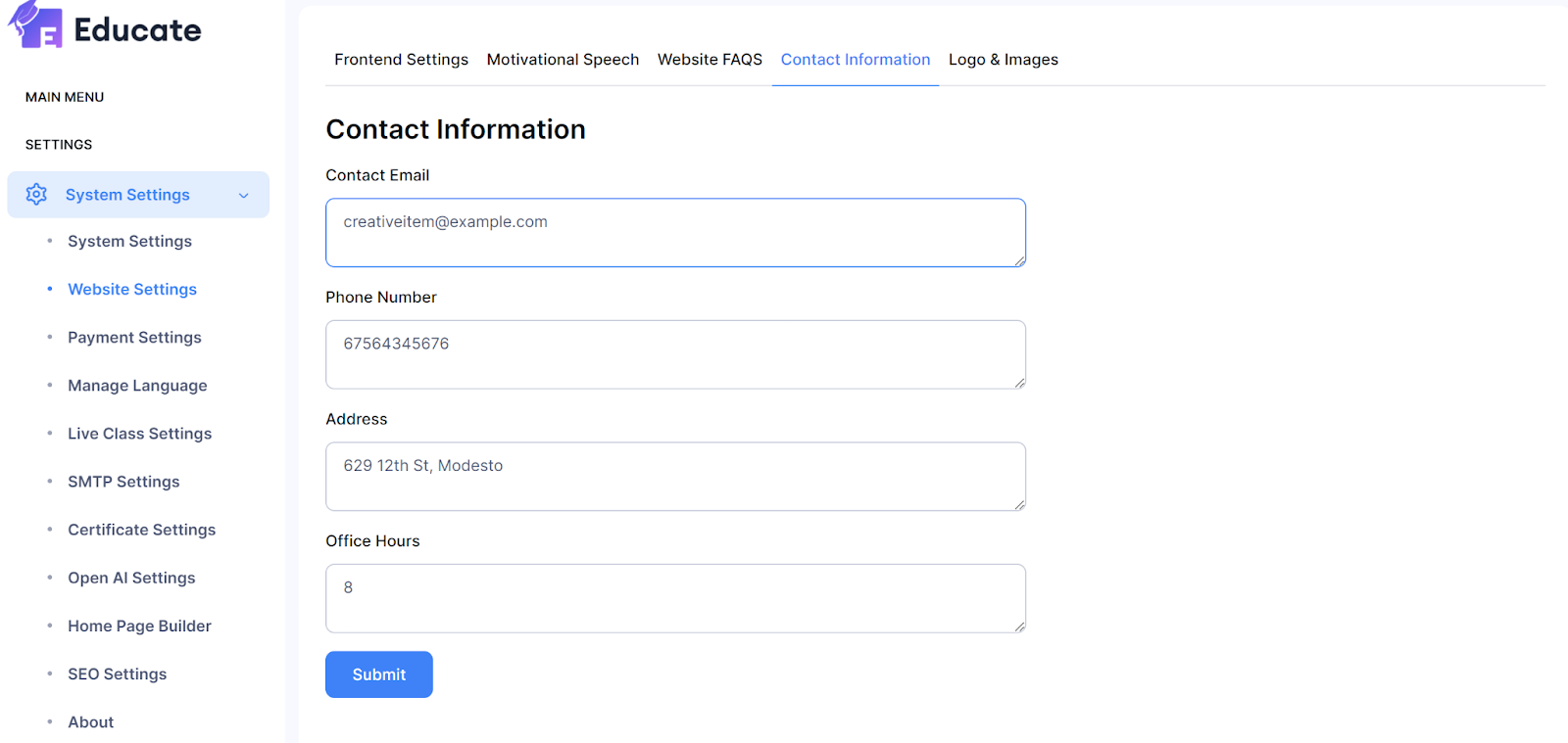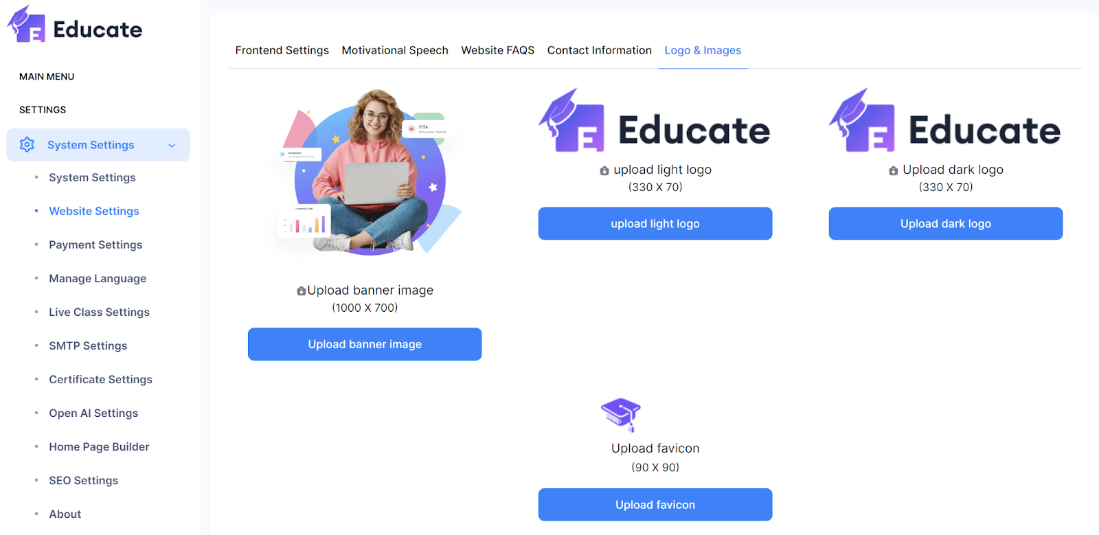Within the website settings panel, you can configure all aspects relevant to your website. This includes settings such as frontend settings, homepage layout, motivational speeches, website FAQs, contact information, and logo images. It is a centralized hub for managing and customizing various elements of your website to align with your preferences and requirements.