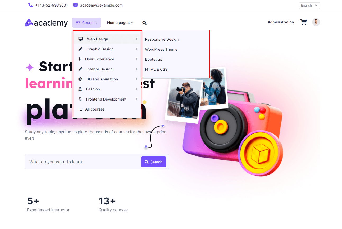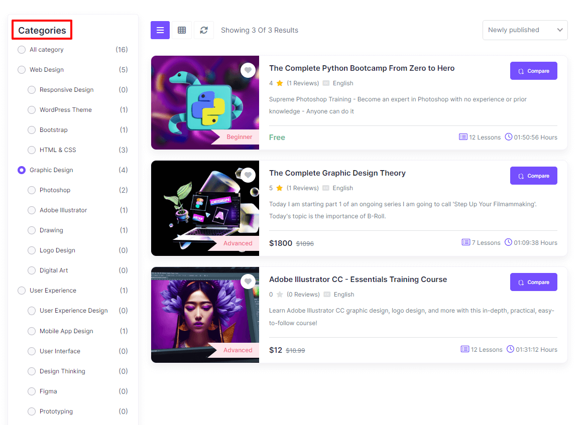 Users can filter Categories, Price, Level, Language, usage courses before signing up to Academy LMS and purchasing courses.