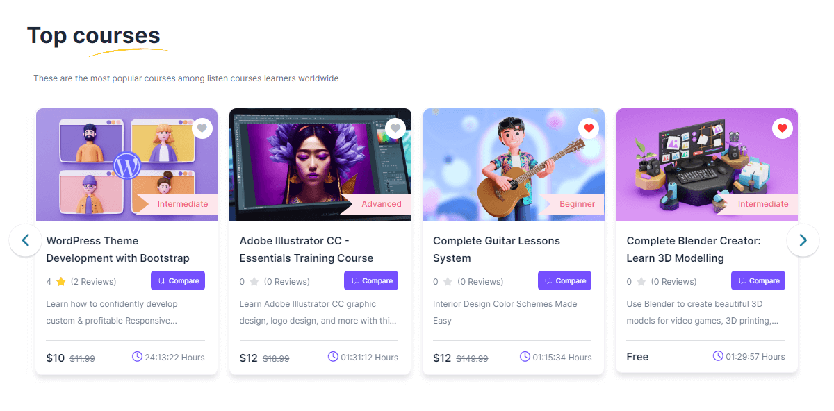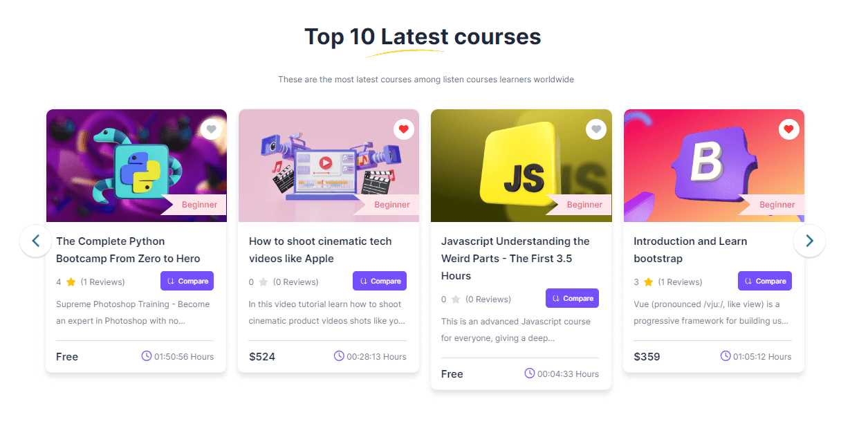 The top 10 latest courses the added to the homepage. Users can select the most recent courses and purchases by signing up.