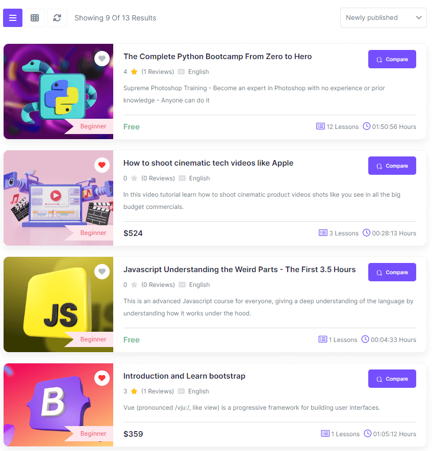 If users want to see all the courses on the course page in a grid, they can see it using the grid icon above.