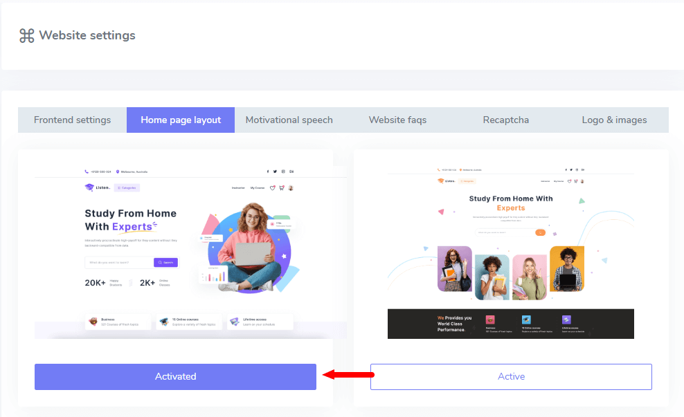 You will get 6 different attractive homepage layouts with Academy LMS version 6. To change the homepage layout, you can follow the steps below.