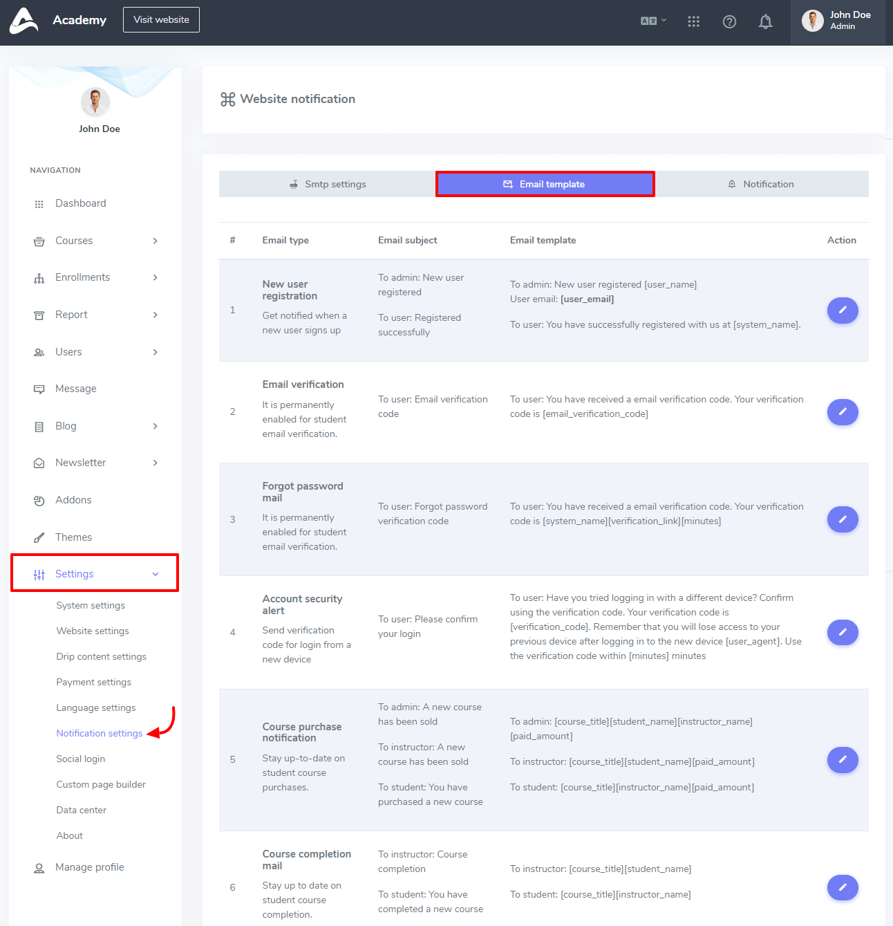 In Academy LMS, you can manage your system notification professionally by switching the button. In this panel, you manage new user registration, email verification, forgot password mail, account security alert, course purchase notification, course completion mail, course eligibility notification, offline payment suspended mail, course bundle purchase notification, new user added as an affiliate, affiliate approval notification, affiliate request cancellation, affiliation money withdrawal request, approval of withdrawal request of affiliation, and course gift notification.