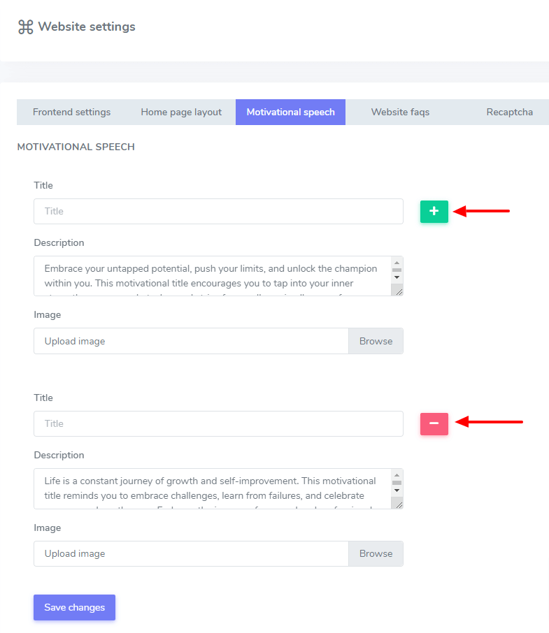 In this settings panel, you can configure your all settings which are related to your website. For example, Frontend settings, Homepage layout, Motivational Speech, Website FAQs, Recaptcha, and logo- images.
