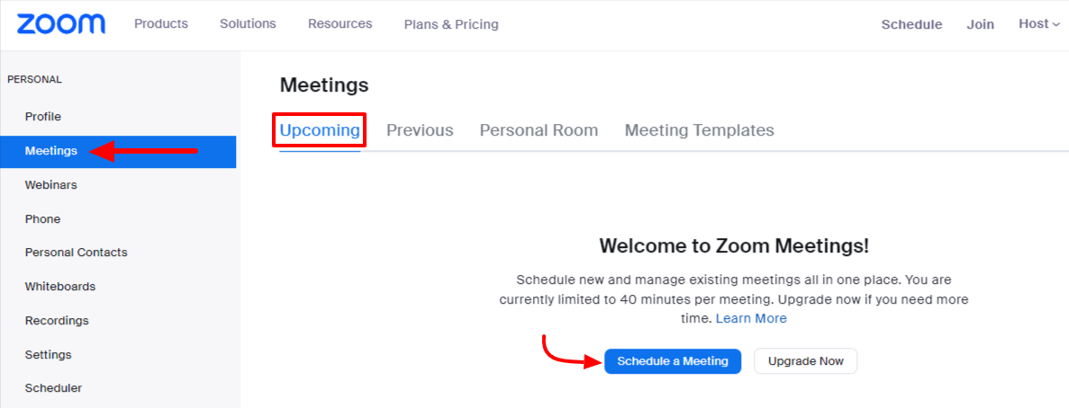 - Click on the "Upcoming" button if you want to schedule your meeting.