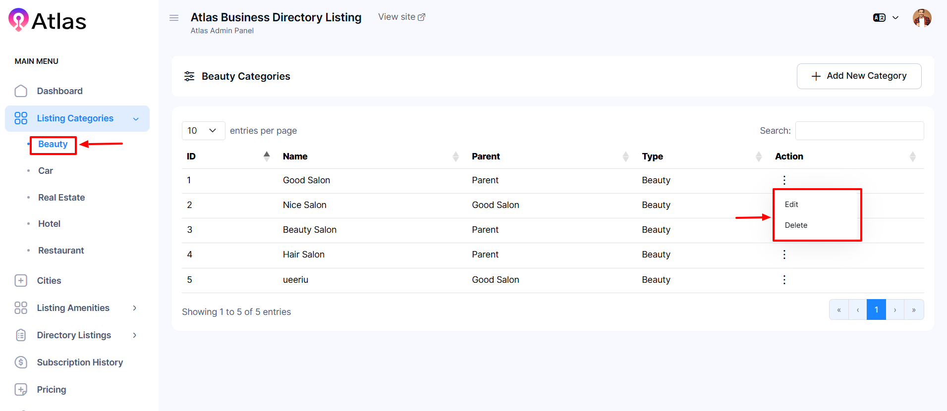 - Next, click the Action button (represented by three dots), and a menu will appear with the following options: Edit and Delete Category.