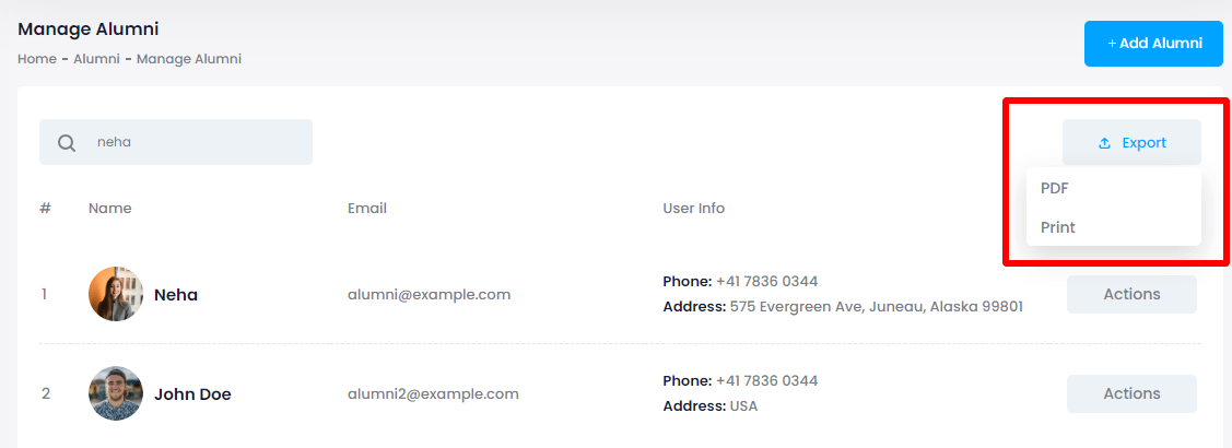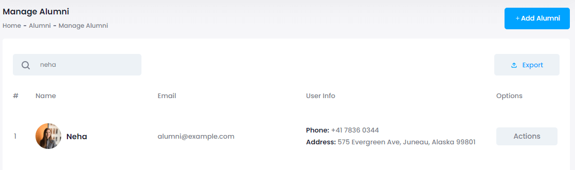 If you want to find a specific Alumni you can find them by filtering their Name on the search option. For this, you can follow the steps below: