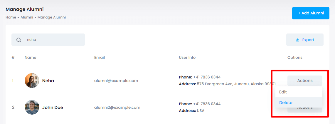 The administrator has access to create alumni. Alumni can edit and update their information after receiving login details from the admin. The following actions could be useful for that: