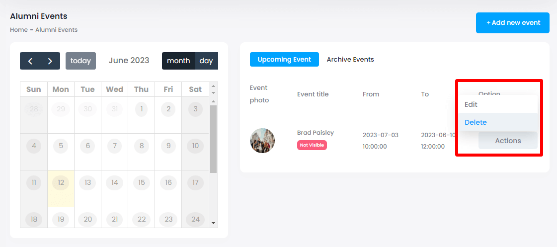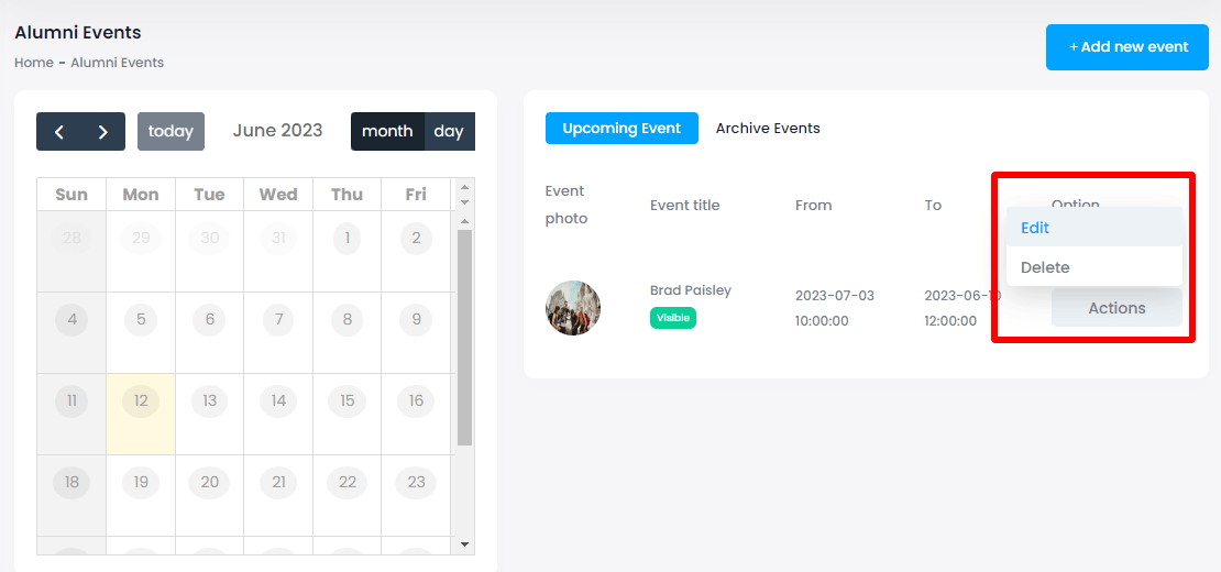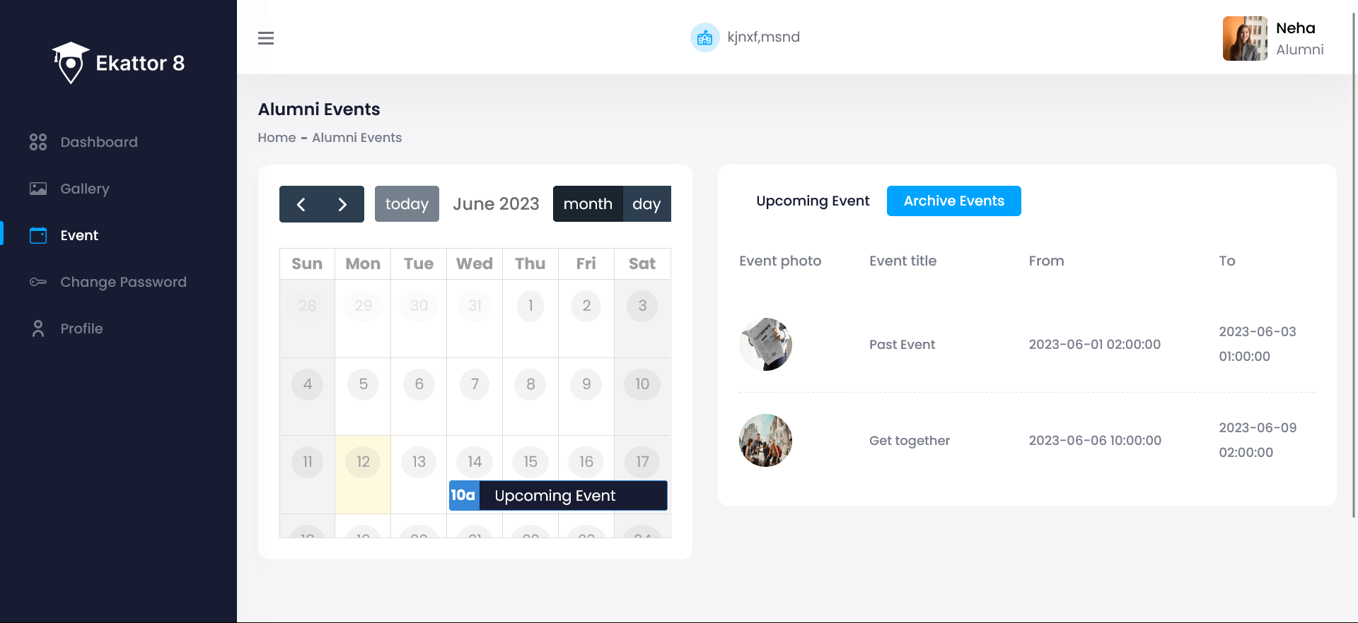 Event: In this section, alumni can view upcoming and archive events created by the admin.