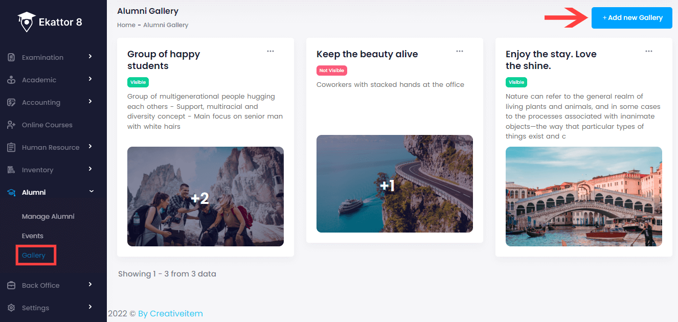 Admin can add Gallery through this Alumni addon. The below steps might be helpful to know how this works: