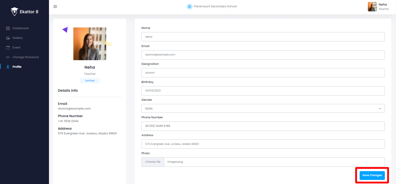 Profile: Alums can edit and update their information after having the login credentials from the Admin. Here they can update all the information provided by the admin. After changing the information they need to click on the "Save Changes" button for updating their information.