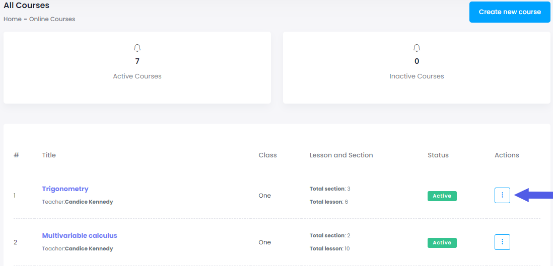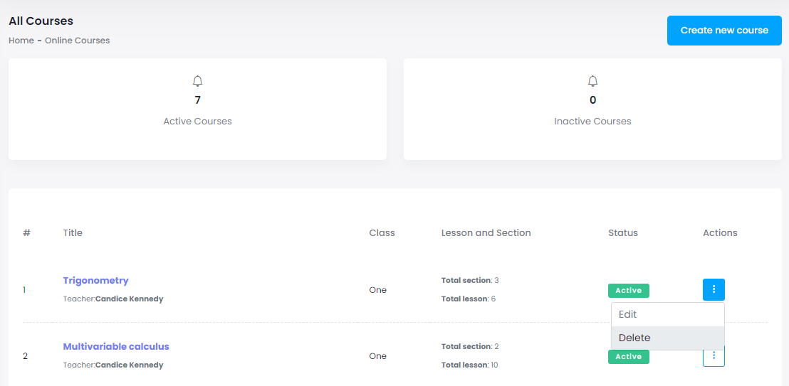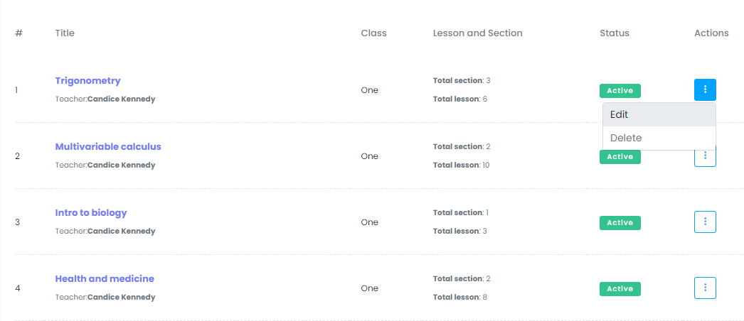 After creating a new course you can update & Modify this course. For updating and modifying the course, select the "Edit" button from the "Action" bar.