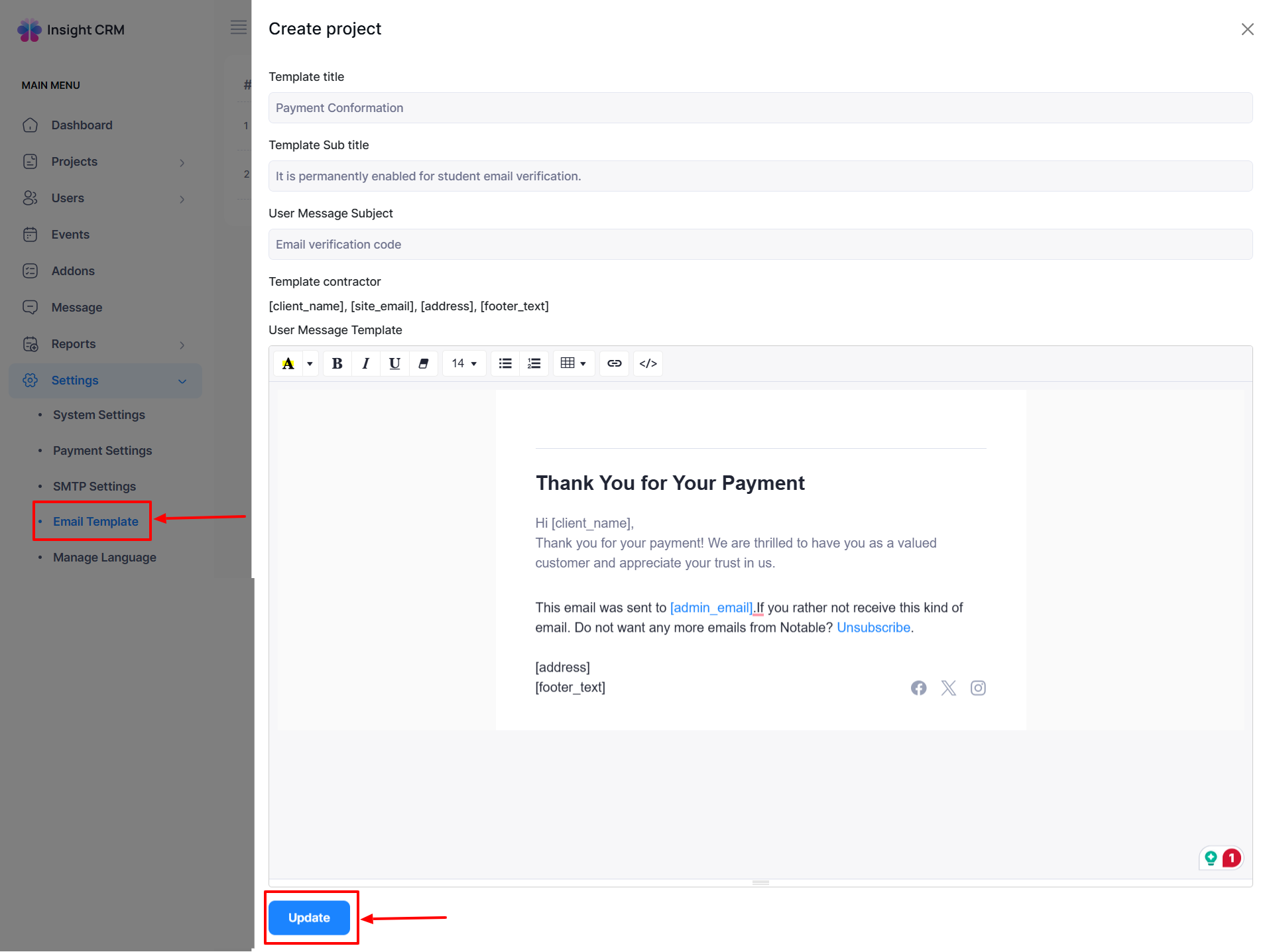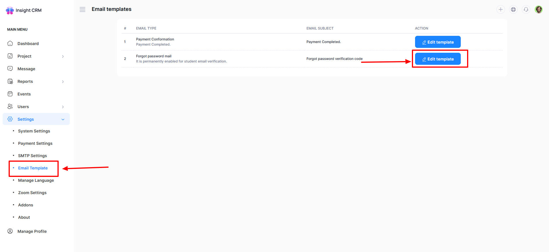 - In the left sub-menu, choose Email Template, and a window will appear.