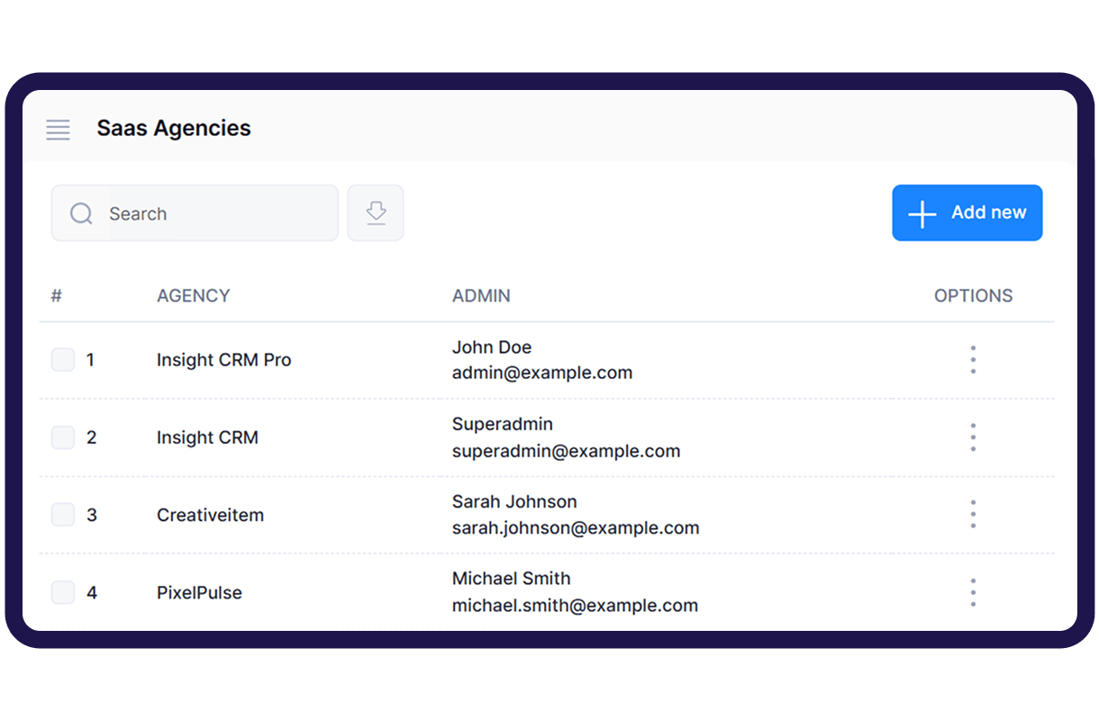 Insight CRM allows Superadmins to manually create and manage SaaS agencies, offering full oversight of setup, users, and configurations.