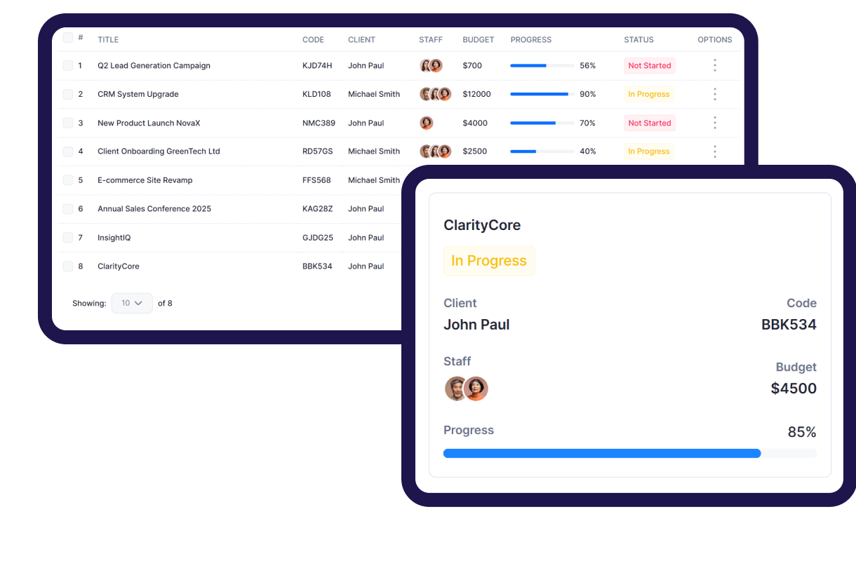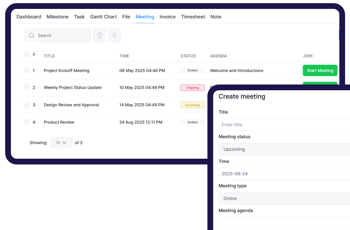 Admins and clients can easily collaborate on projects through our built-in live meeting feature, enabling real-time discussions, faster decision-making, and seamless communication.