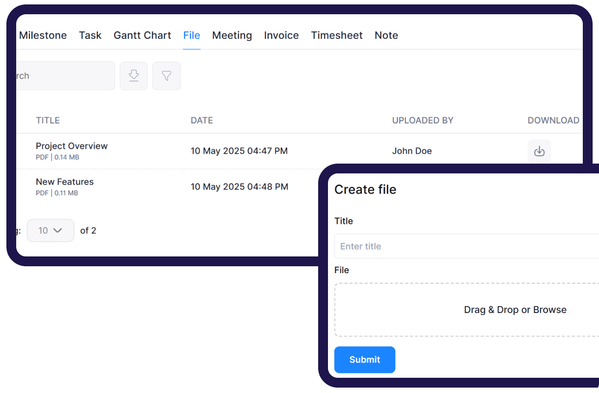 Seamless file handling between admins and clients with secure uploads, downloads, and sharing, improving collaboration and ensuring timely project completion.