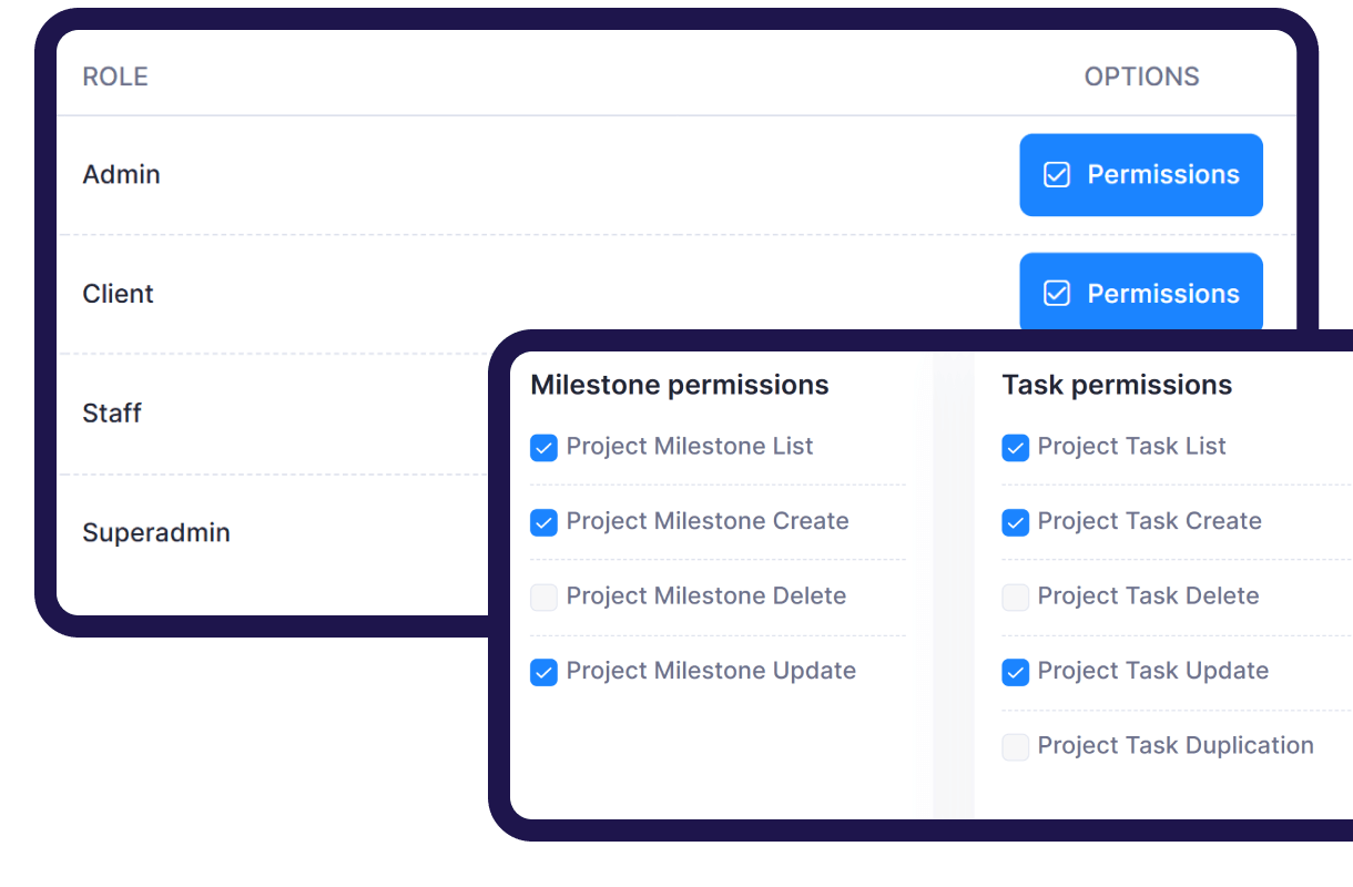 Insight CRM allows defining roles with specific permissions, controlling user access and actions efficiently across projects and tasks.