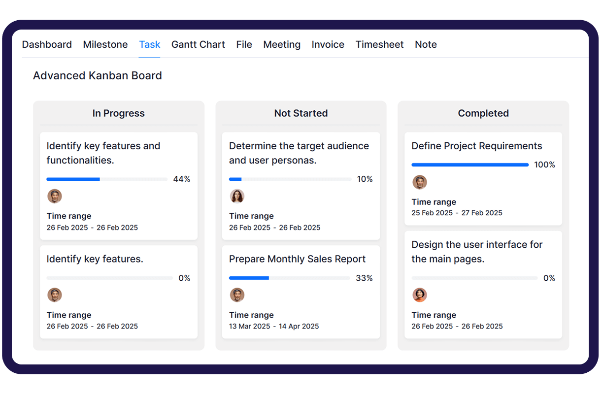 A clear visual board that displays project tasks, workflow stages, and overall progress to improve collaboration and team productivity.