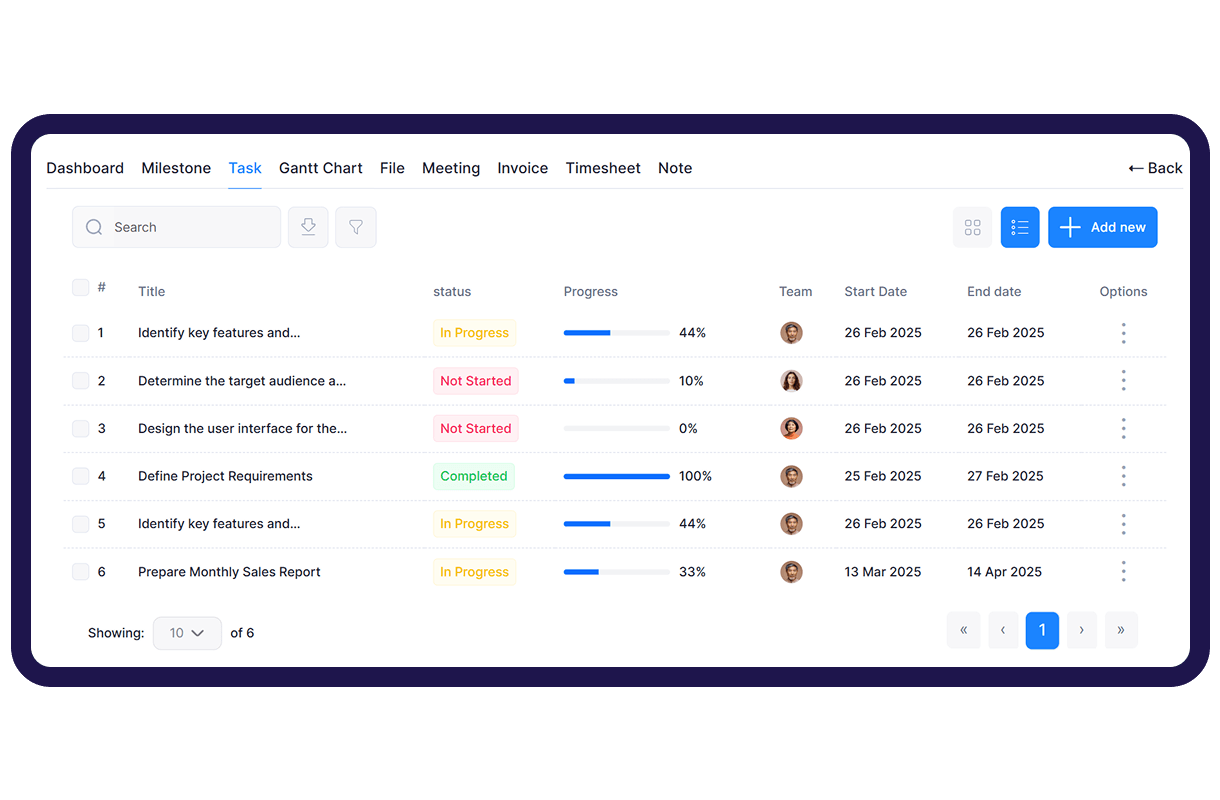 Projects in both grid and list formats for better organization, flexible management, and improved visibility across all tasks and workflows.