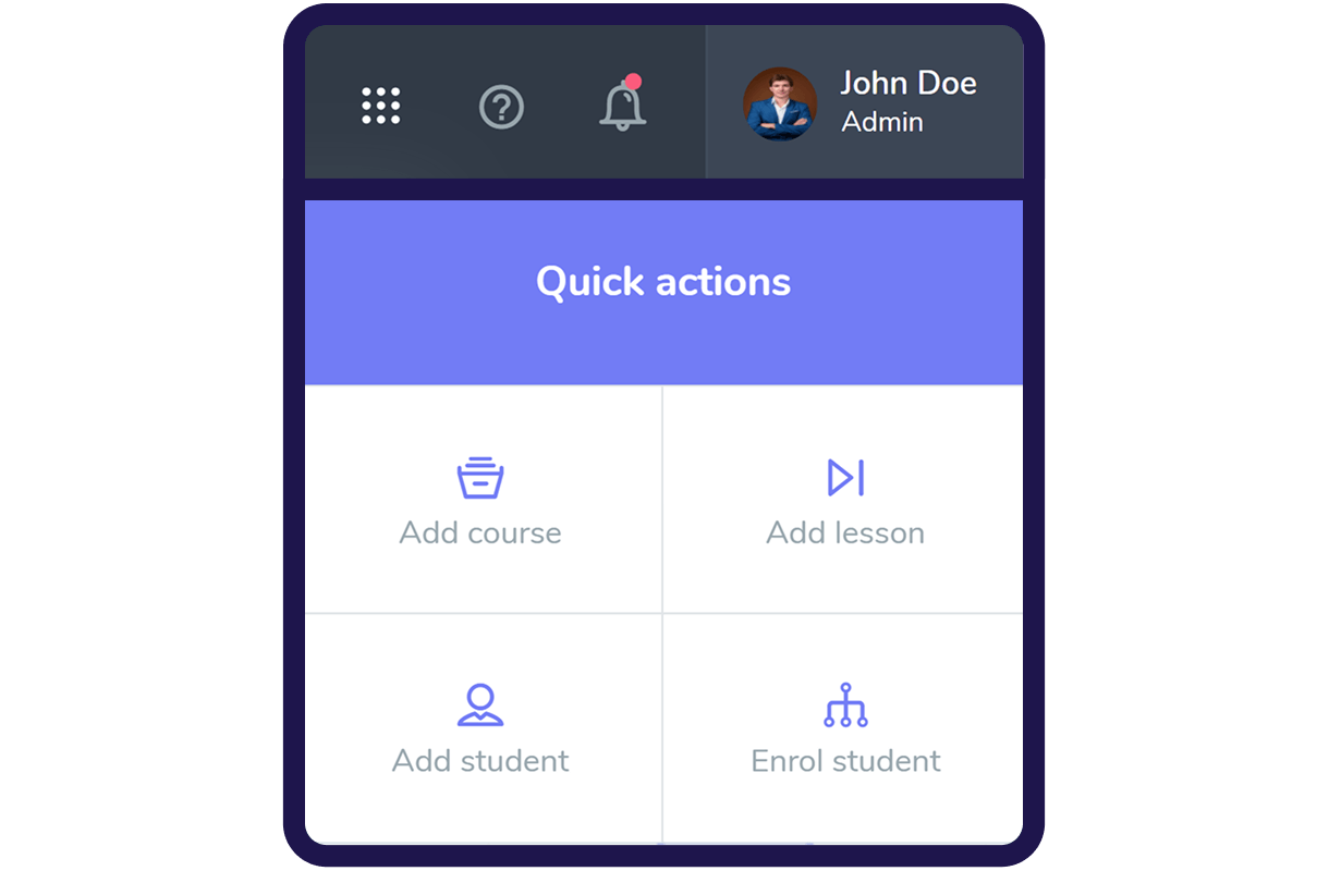 Save time with a quick action button that lets admins and instructors instantly add courses or lessons from anywhere in the dashboard.