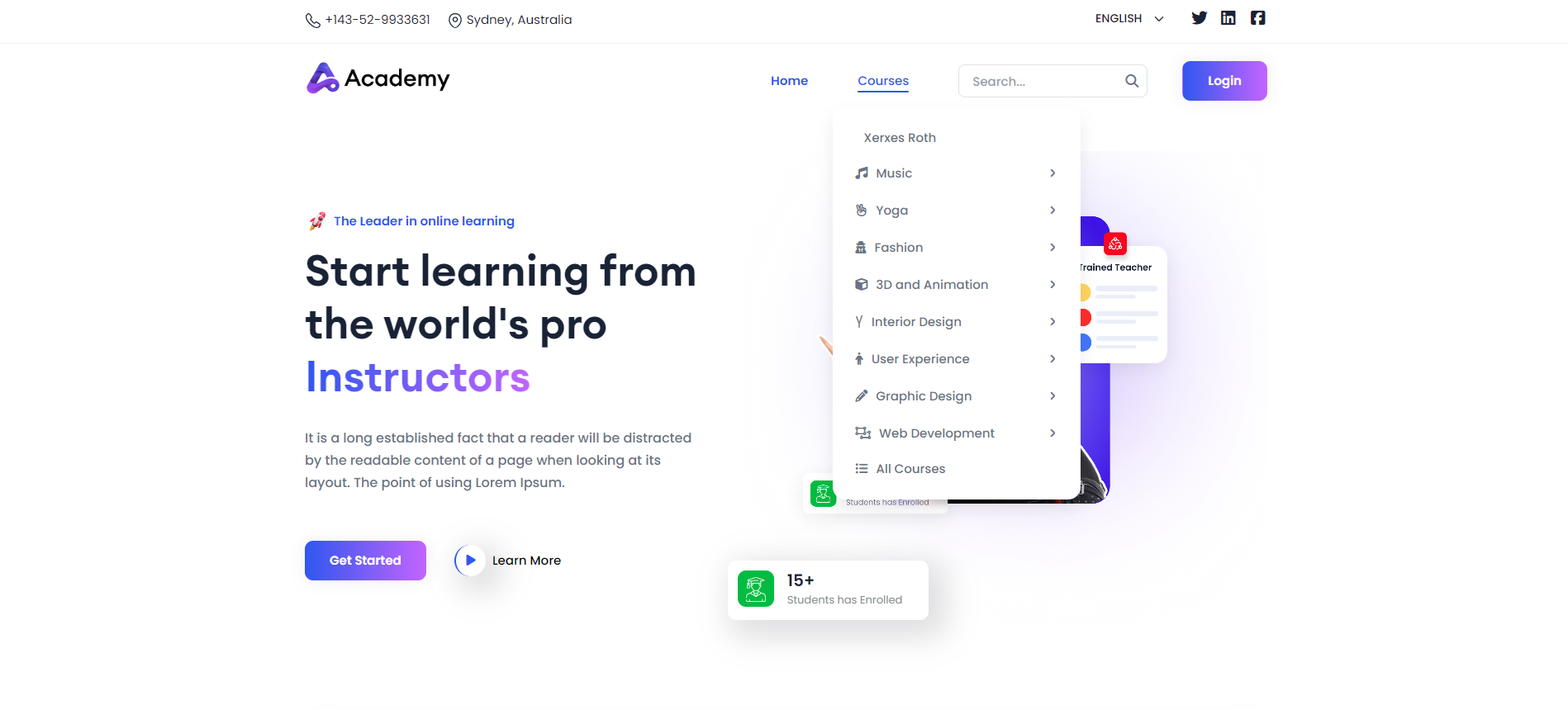 Users can freely access most frontend pages without the need to log in initially. Upon visiting the Academy LMS Laravel application without signing up, they can browse the Course Search option on the homepage, along with the top courses and featured courses highlighted for easy exploration.