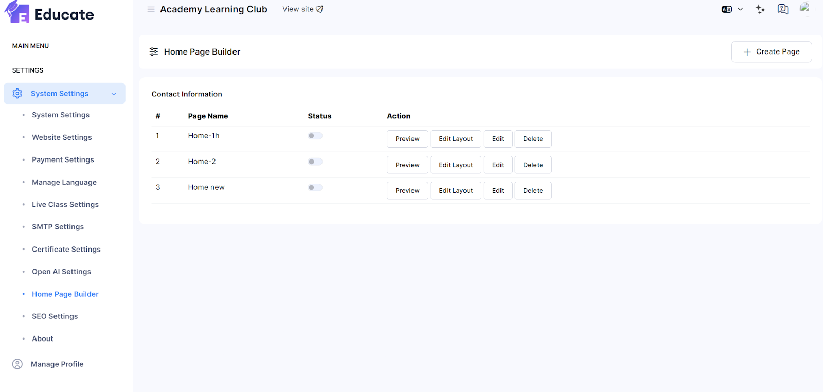 If you want to Preview the homepage, click on Preview beside the selected page layout, and it will open the current layout of the homepage of the system in a new tab.