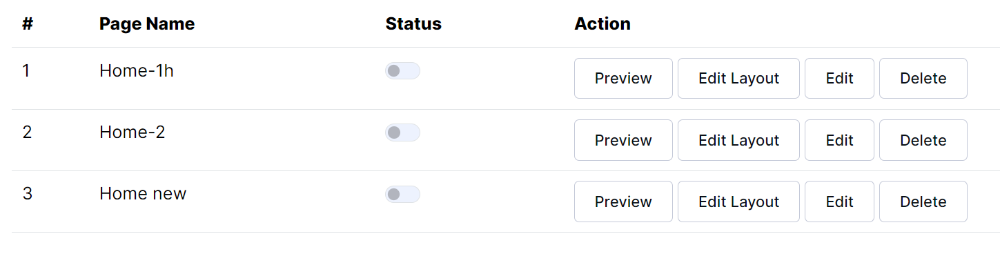 After you click submit, you can see the new page name inside the list with the name, status of the page (whether it is enabled or disabled), and actions you can take.