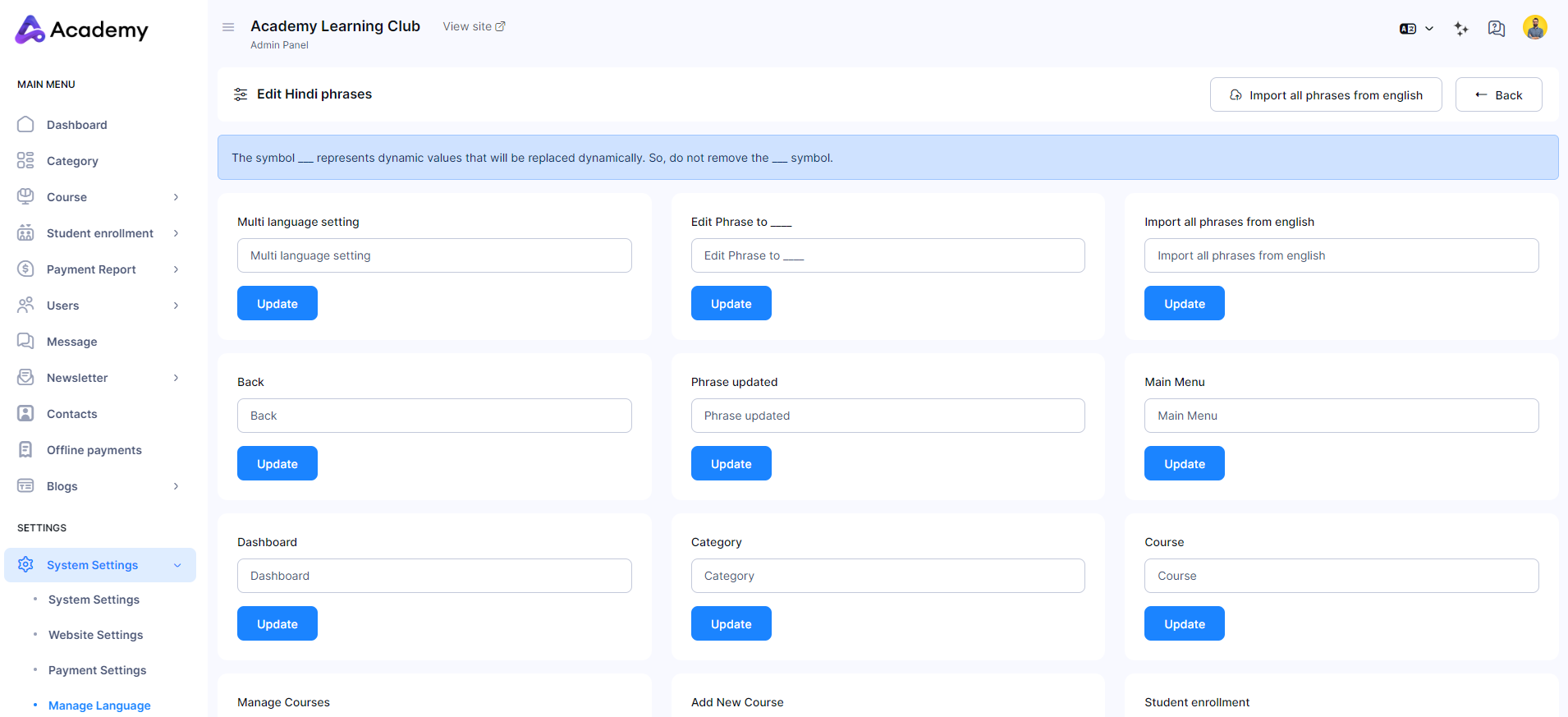 You can update any phrase to the desired language inside the respective fields. Click on Update after entering the phrase.