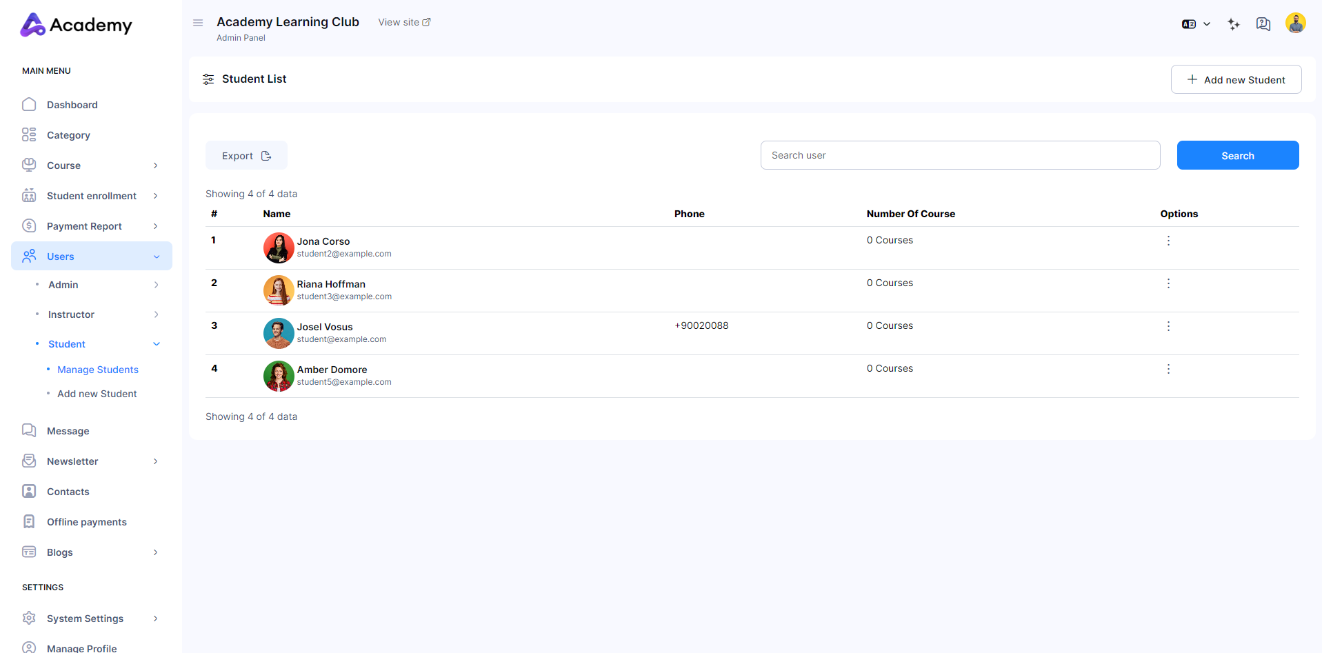 You can view the students list with their names, phone numbers, number of courses that they are enrolled in.